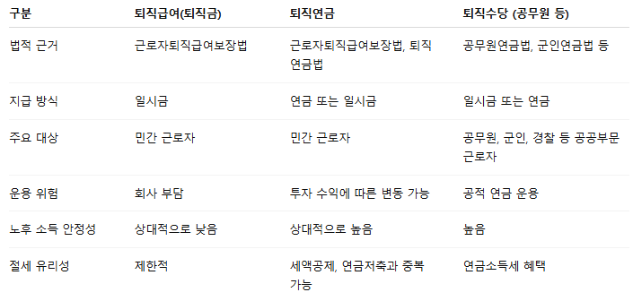 퇴직급여, 퇴직연금, 퇴직수당은 근로자의 퇴직 후 생활 안정에 필수적인 제도이지만, 각각 법적 근거와 지급 방식, 절세 혜택에 차이가 큽니다.