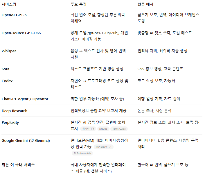 “AI는 멀리 있는 기술”이라는 말은 이제 옛말입니다. 현재 AI는 대학 연구실이나 기술 기업만의 전유물이 아닌, 일반 사용자도 손쉽게 활용할 수 있는 생활 도우미로 자리 잡았습니다. 2025년을 기점으로, OpenAI의 GPT-5, Whisper, Codex, 그리고 ChatGPT Agent와 같은 대표적인 AI 모델과 함께, Perplexity, Google Gemini, 국내의 뤼튼 등의 서비스들도 일상에서 사용 가능한 수준으로 발전했습니다.