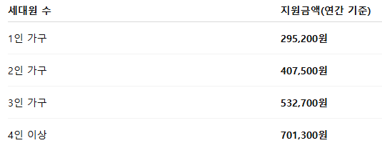 지원금액은 세대원 수에 따라 다음과 같이 차등 지급됩니다.