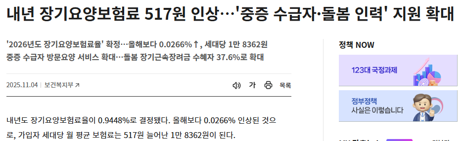 특히 최근 장기요양 수급자가 빠르게 증가하고, 중증 수급자 중심의 서비스 확대 정책이 강화되면서 보험료율 조정이 불가피해졌습니다. 2026년 보험료율은 2025년 0.9182%에서 0.9448%로 0.0266%p 상승했으며, 가구당 월평균 보험료는 약 18,362원, 즉 전년보다 약 517원 증가할 것으로 예상됩니다. 이 변화가 실제로 기업에는 어떤 영향을 주고, 직원들은 어떤 정보를 숙지해야 할까요? 아래에서 종합적으로 정리해드립니다.